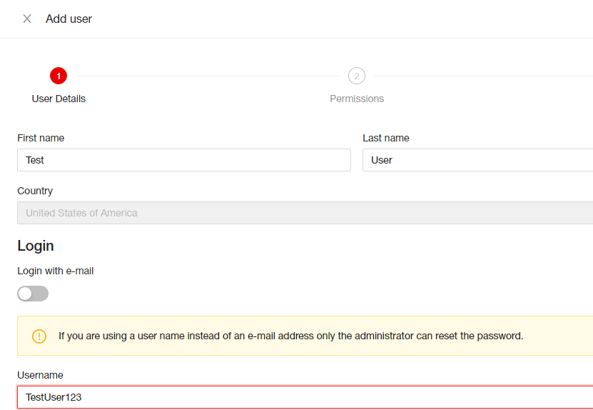 4) Enter the First and Last Name of the User and their email address. If you do not want to use an email address, and prefer to create a unique username, change the Login with e-mail switch from green to grey: