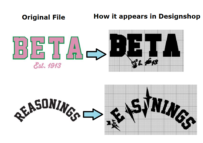 In some cases, vector files in an .SVG format will appear garbled when opened in DesignShop (see examples below).