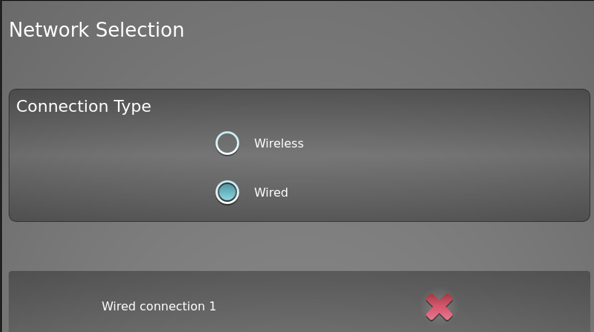 At the top of the Settings is Network Selection > Connection Type: Wireless or Wired.