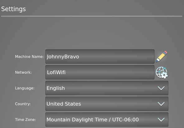 Select the Green checkmark to leave that screen. You will back on the Settings screen. You have the option to change the Machine Name, pick the Language, etc.