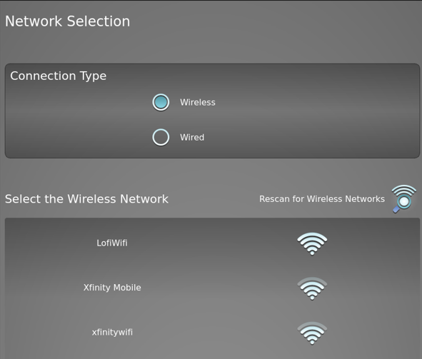 Select Wireless for the Connection Type. It will add a section below, and allow you to pick a Wireless Network from the list of available options. Pick your selection.