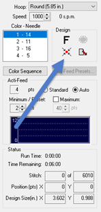 It is common practice to center embroidery designs before sewing them or saving them for the final time. It is also a good idea to make sure that designs supplied from outside sources are centered. If this is not done prior to loading a design to MOS or Bravo OS, you will notice that it appears off center in the OS. Melco provides a tool, shown below, in the OS to center a design.
