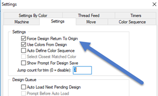 It is also important that designs finish by returning to their start point. This is called Returning to Origin and the OS by default does this automatically. This setting is located in the Tools>Settings>Settings Tab.